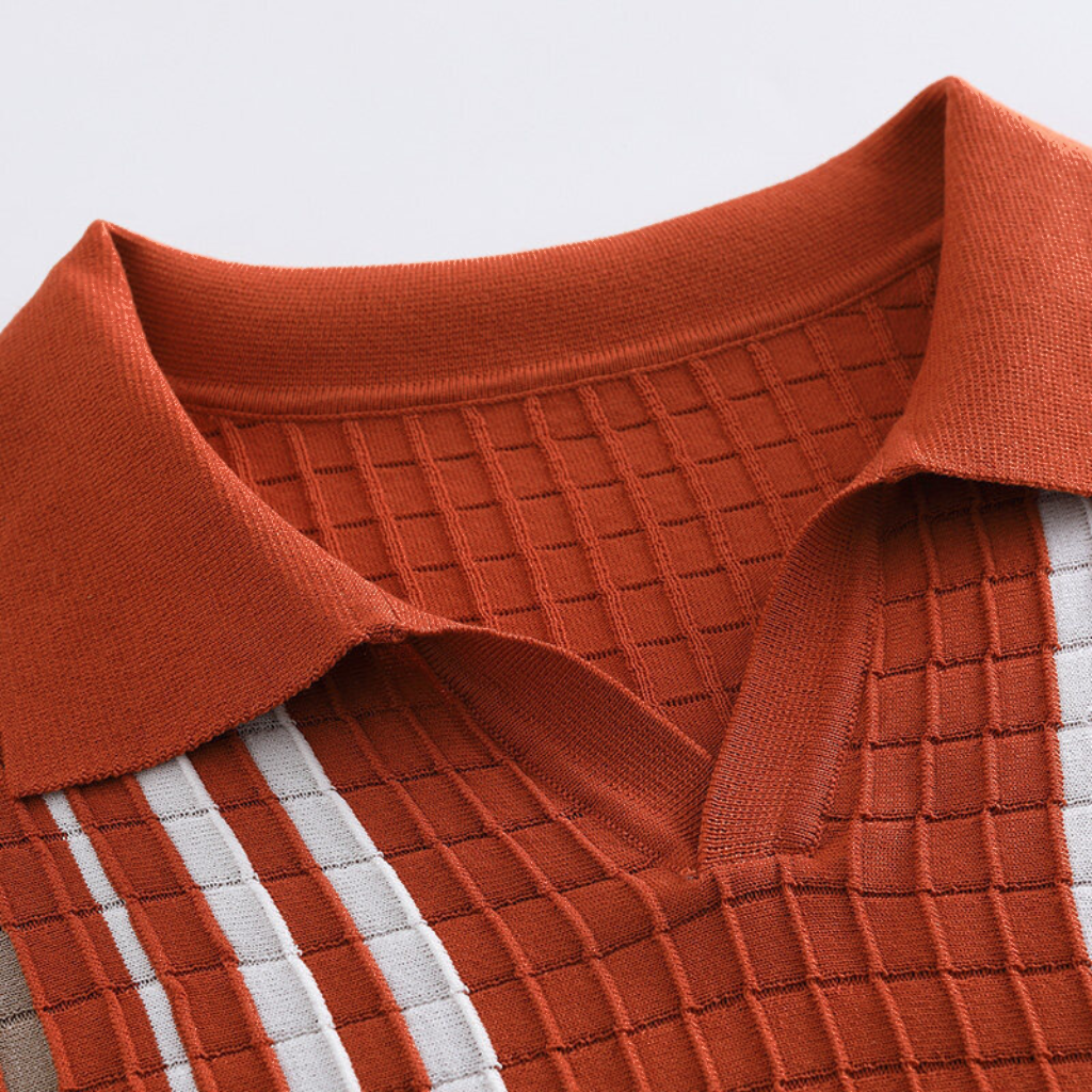 Crafted from a stretchy grid-knit, this polo combines a breathable summer feel with a clean vintage cut. The vertical stripes carry a classic knit character, while the open V-collar and short sleeves make it a go-to for warm-weather wear.